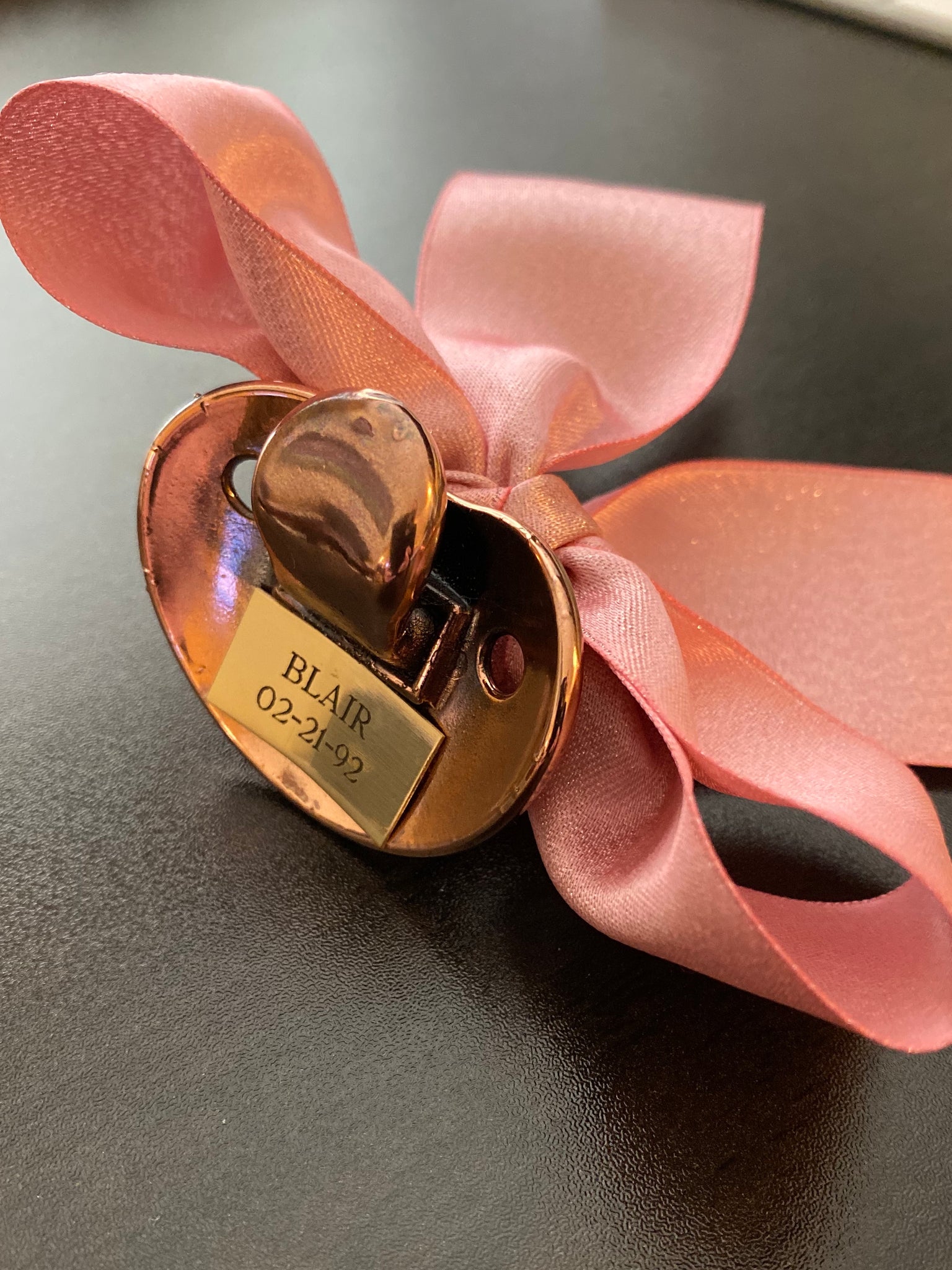 We can bronze in the hard plastic pacifier.    Each Paci comes with first name and birth date tag.    Ribbon is a black/bronze Patty-Cakes logo.